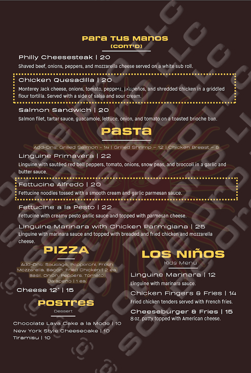 Shrimp, squid, mussels, clams, whole lobster tail, peppers, tomato sauce, & saffron, rice.