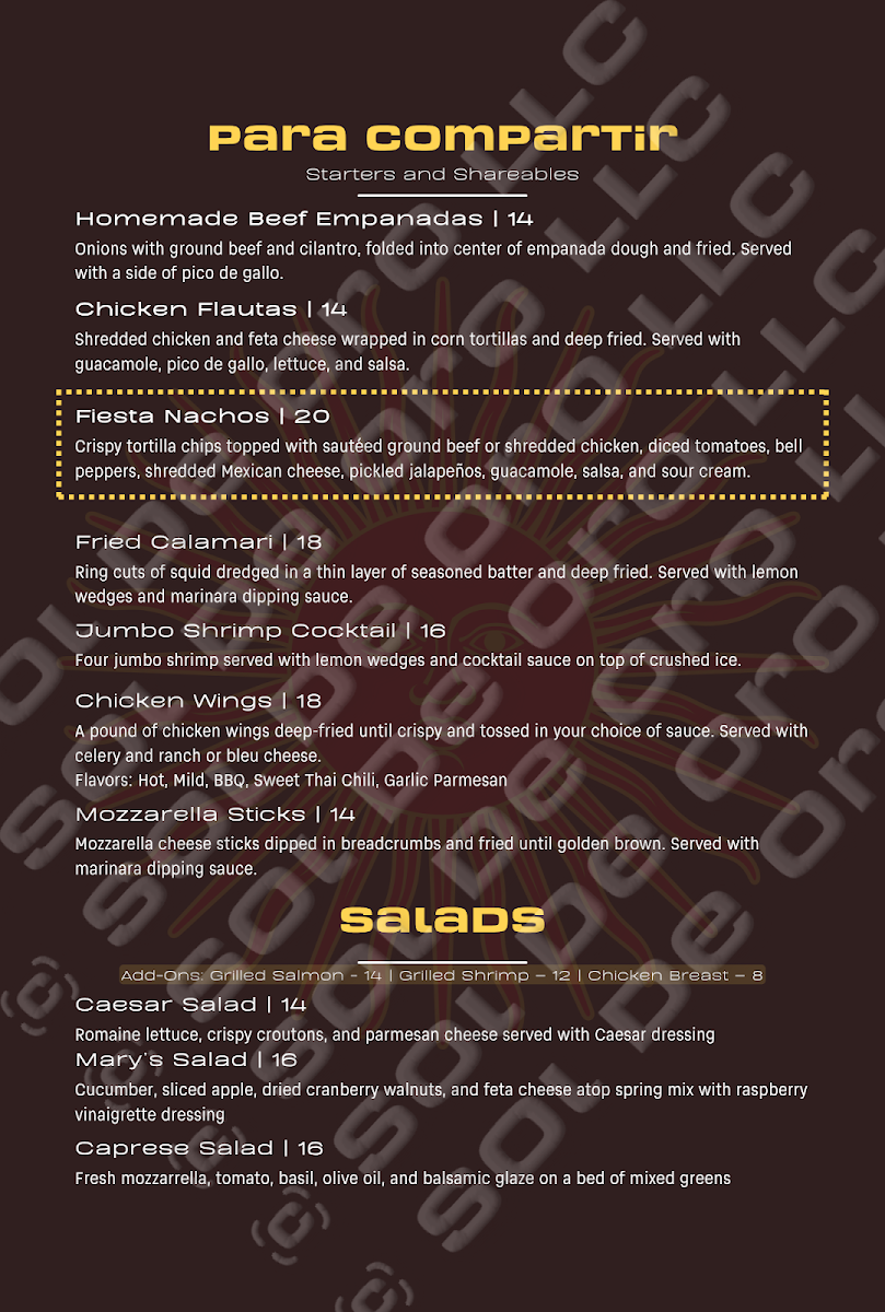 Onions, tomato, peppers, Mexican cheese, jalapeño, beef, guacamole, salsa, sour cream.